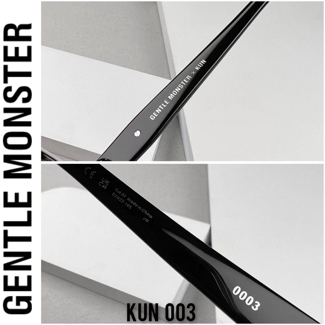 Every authentic set carries a product name like “Her” or “Lilit,” a color code like as “01,” and size measurements in the 48□22–145 layout. These must match the official model page exactly, including spacing and hyphens. If the seller’s pair uses any name or code that doesn’t exist on the website, that’s a serious red flag. Dimension markings should be precise and evenly aligned, not applied thickly or crooked. Gentle Monster nomenclature is consistent across the catalog, so oddball codes are a tell.